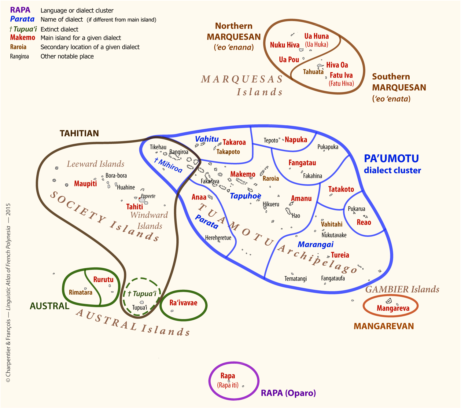 Here is the reference map we propose for the languages of French Polynesia. (Click to enlarge.)