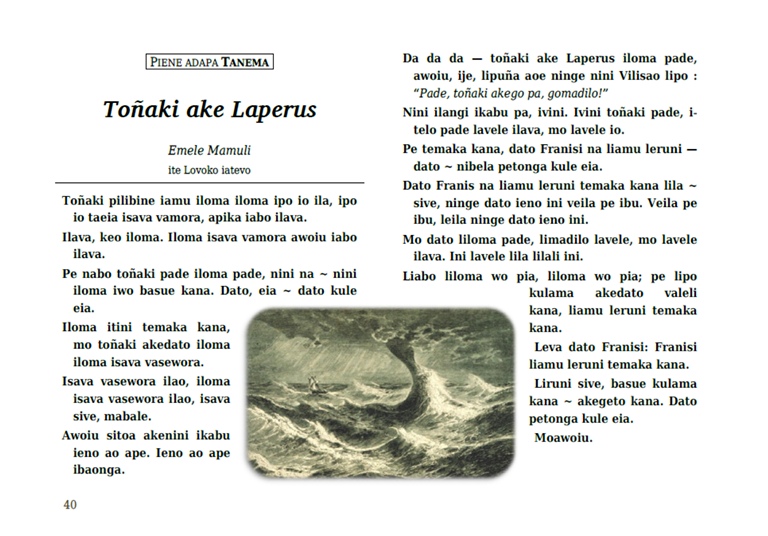 Liatevo iepiene ñe piene akapa: Traditional stories from Vanikoro (Solomon Is). Collection of tales taken from the oral tradition of Vanikoro (Solomon Is). Texts in Teanu, Lovono and Tanema, for local use. Illustrated by Sawako François. Self-published. 42 pp.