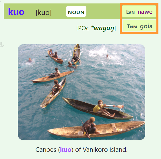 comparative study of Vanikoro languages, these two languages prove very similar to Teanu with respect to semantics and grammars; but they can be quite different in their word forms. These forms are cited as [lvn] and [tnm], in the top right corner of each entry. They can be quite instructive for the historical linguist wishing to compare the three languages of Vanikoro,