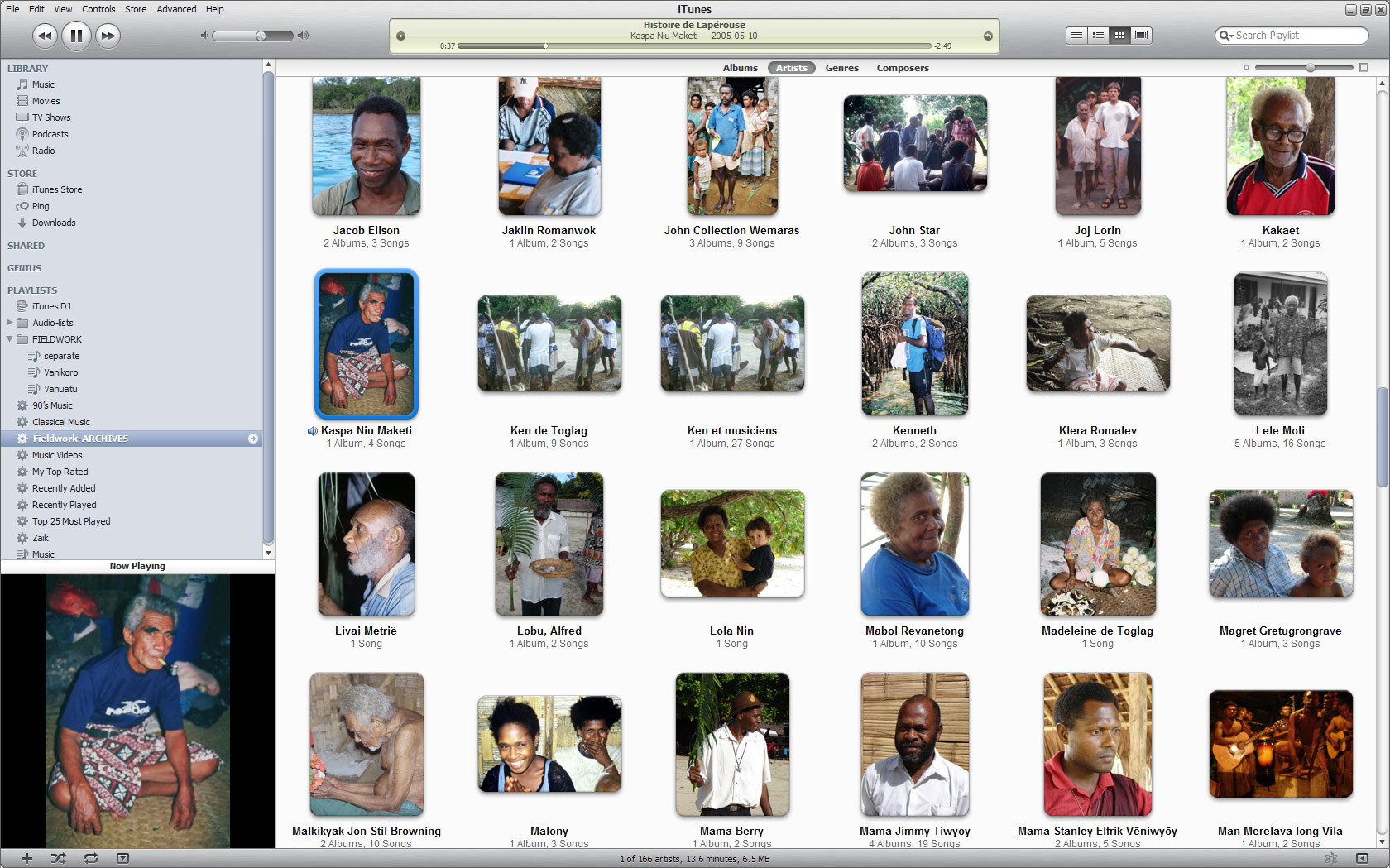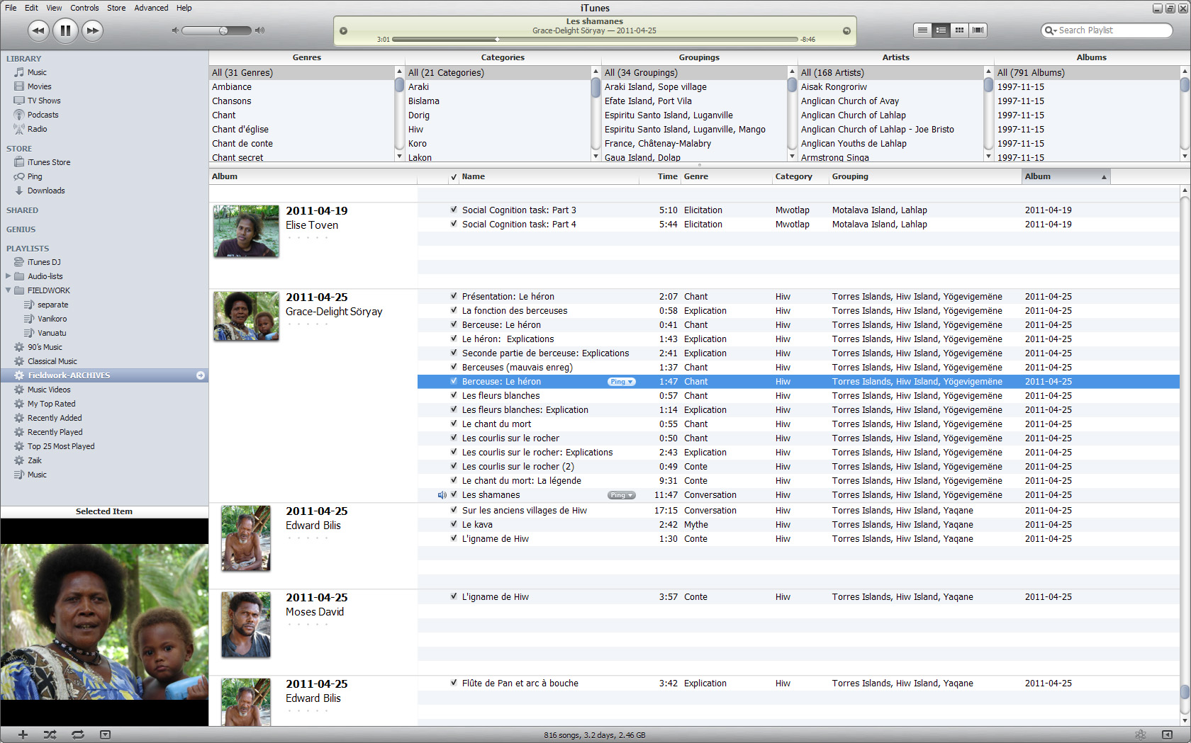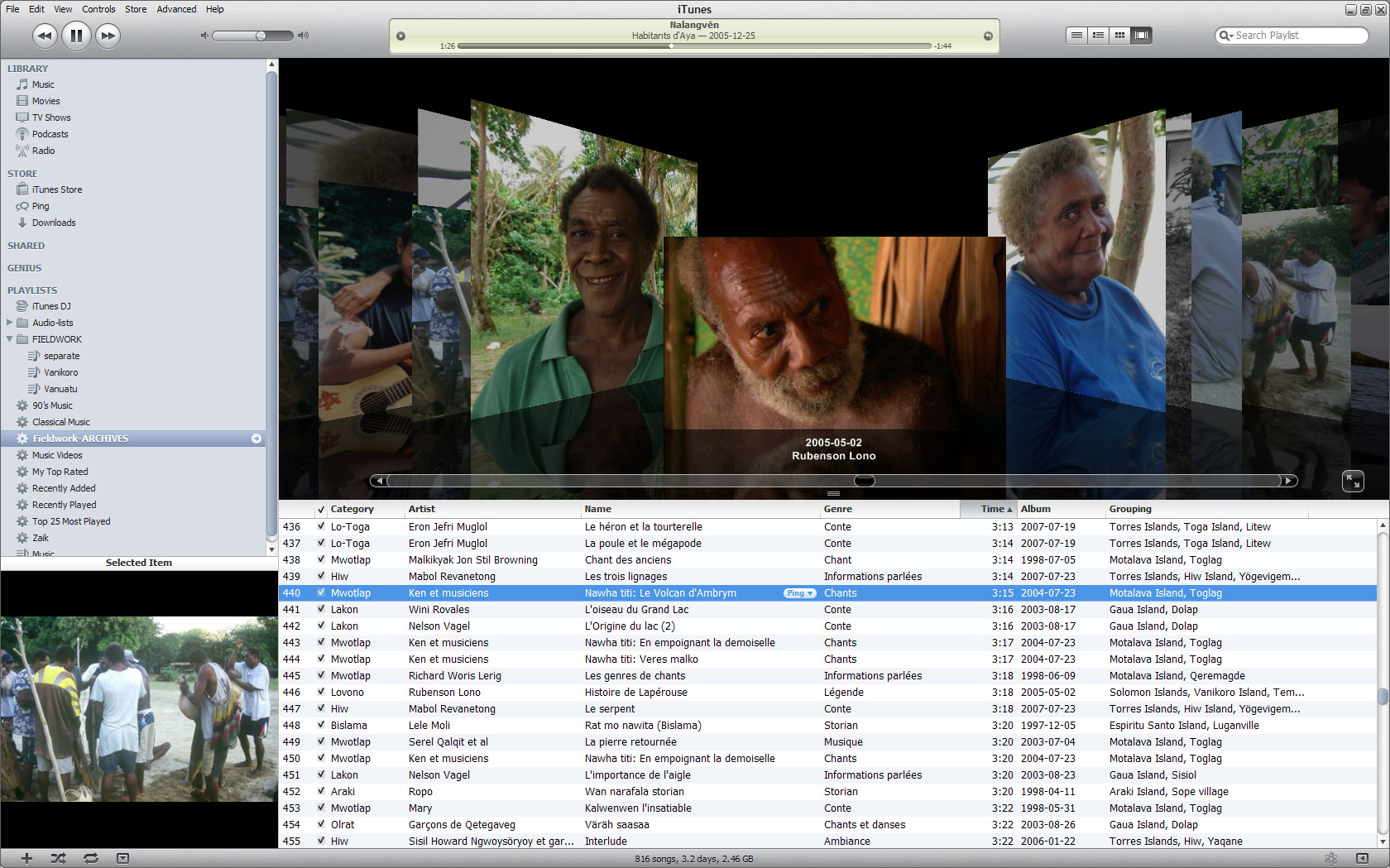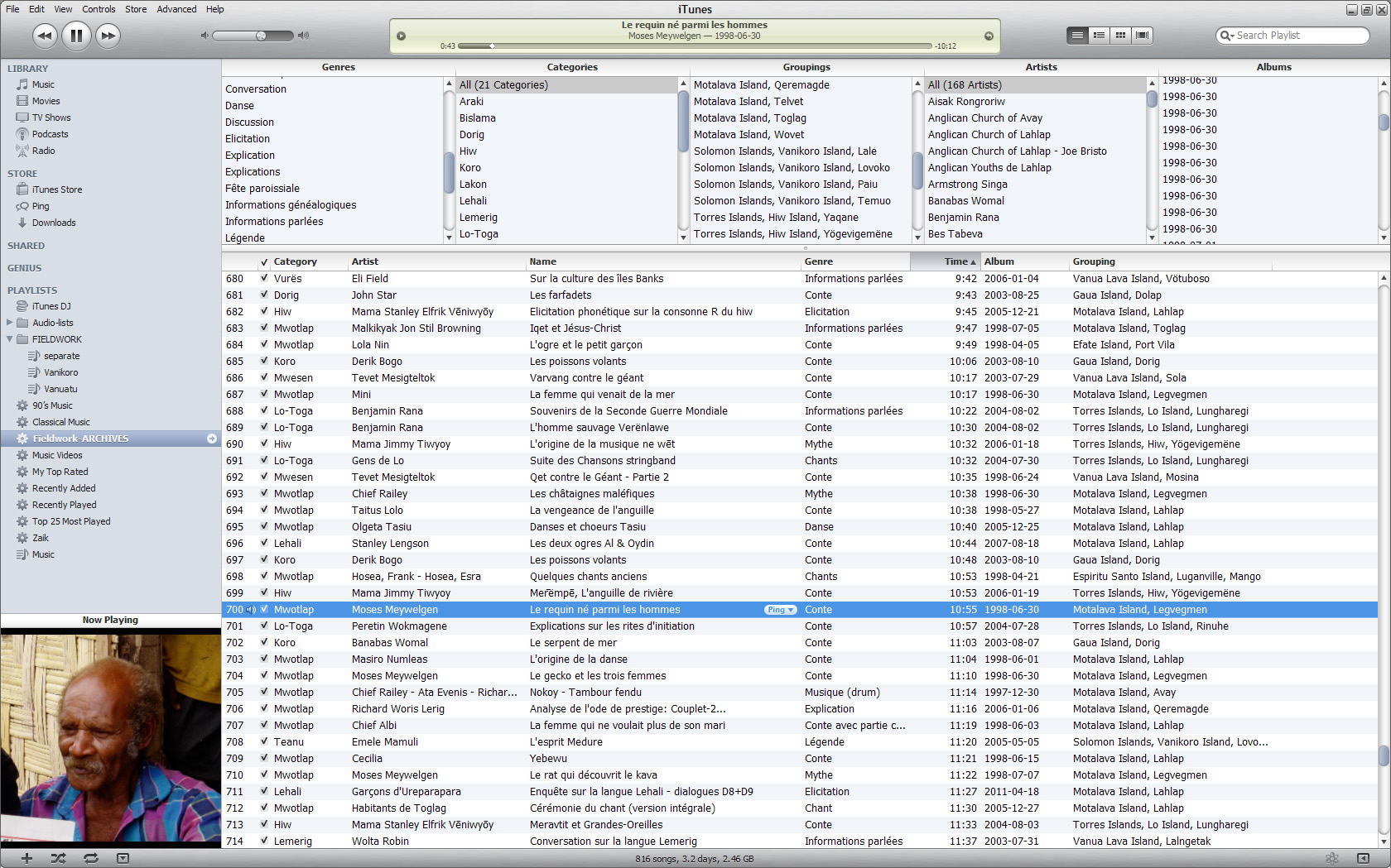 iTunes makes it easy to search through a whole collection, and quickly retrieve any file. Thanks to a patient editing of metadata, it is also capable of quickly filtering the archives by language, by location of recording, by individual speakers, by genre… It was quickly adopted by the islanders for whom I had designed the whole thing.