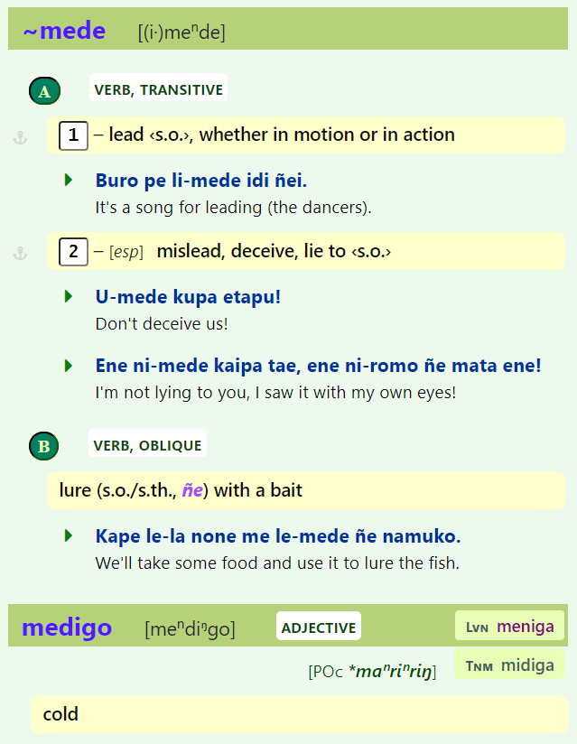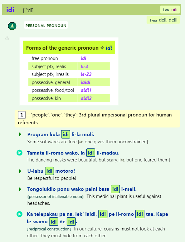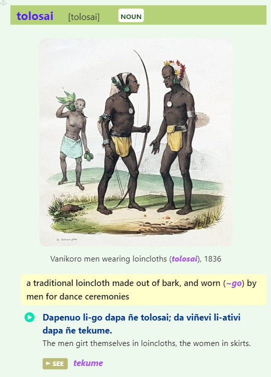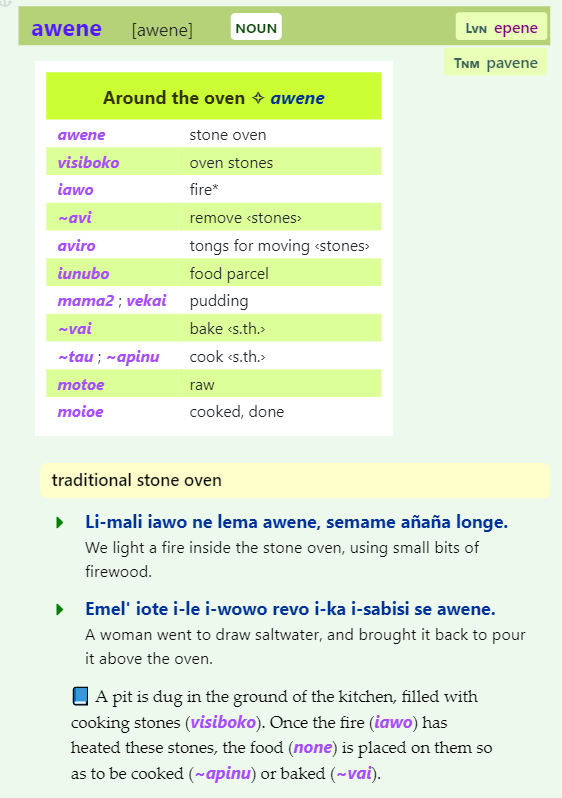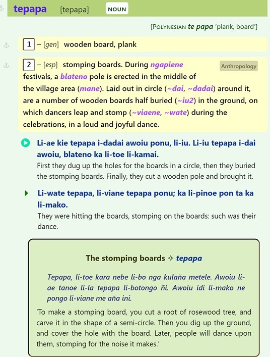 I write the contents of this dictionary using the free software Toolbox. I regularly convert my Toolbox files to XML, using a Python script written (initially for my Mwotlap dictionary) by two IT engineers – respectively Céline Buret for Pylmflib, and Benjamin Galliot for Lexika – (with the support of LabEx EFL in 2016 and 2017). Clément Plancq (Lattice-CNRS) wrote the script for the search engine. I personally contribute to all segments of the chain: Lex, Python, Xml, Xslt, Js, Css, Html.