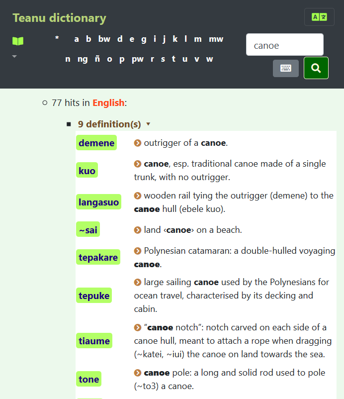 This dictionary of Vanikoro languages focuses on the main language Teanu, yet includes also data from the two endangered languages Lovono and Tanema. Its 1880 headwords (1450 entries, 330 subentries) take their source in my field notes and text corpora, collected during my short time working in Vanikoro. The dictionary features a total of 2800 definitions, bearing witness to the rich polysemies of Teanu words.
