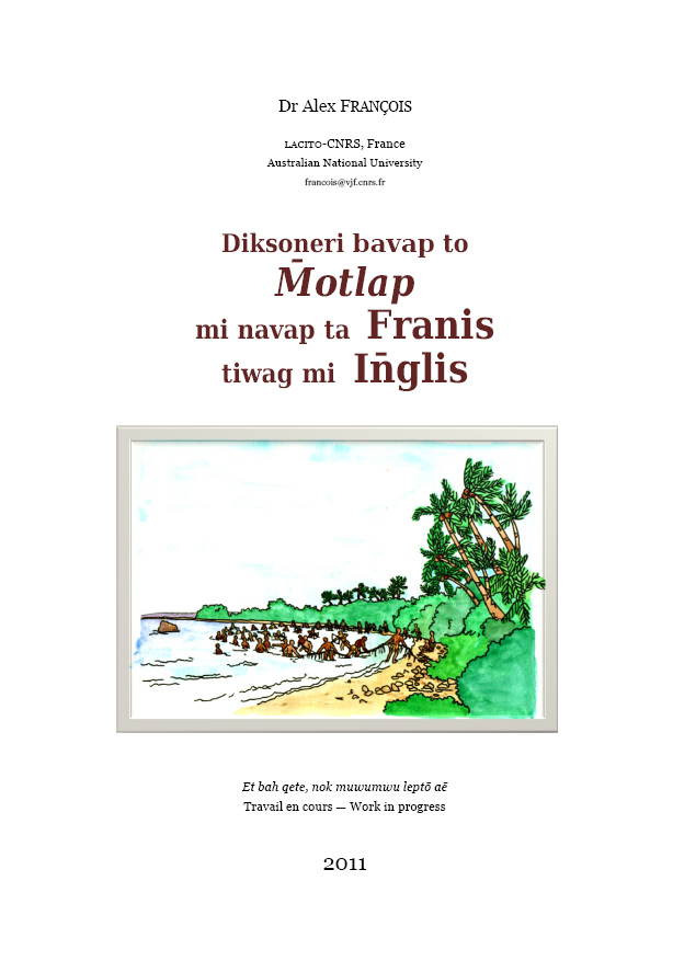 Résumé de la thèse: Langue de tradition orale parlée par 1800 personnes au nord du Vanuatu (Mélanésie, Pacifique), le mwotlap (motlav) appartient à la branche océanienne de la famille austronésienne. Au fil d'une description grammaticale aussi complète que possible, le mwotlap nous permet d'aborder diverses problématiques dans l'esprit de la linguistique générale et typologique : phonologie, morphologie ; catégories syntaxiques, opposition verbo-nominale ; construction de la référence, déixis, possession et quantification ; valence, diathèse et séries verbales ; opérations aspecto-modales ; pragmatique du discours et argumentation. Chaque fait de langue est à la fois décrit en synchronie, et replacé dans son contexte historique. Se dessinent ainsi de multiples parcours de grammaticalisation, des processus de réanalyses formelles ou sémantiques ; et parfois, sous la pression des diverses contraintes cognitives ou structurelles, la puissance de l'innovation conduit à de spectaculaires bouleversements.