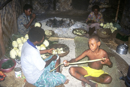 Voilà, notre promenade autour de l'île de Motalava est déjà terminée. Le parcours que vous venez de suivre dans la grammaire du mwotlap devrait vous permettre de reconnaître et ressentir la plupart des mots de notre belle complainte dans le texte original – à moins que ce ne soit l'inverse, les paroles de cette chanson permettant d'entrer facilement dans presque tous les recoins d'une langue et d'une culture assez bien représentative des îles mélanésiennes du Pacifique, entre Papouasie du côté du couchant et Polynésie au levant. En parlant de soleil couchant, si nous allions écouter, pour finir, le diseur de mythes Taitus Lolo, nous conter l'origine de la nuit et du sommeil parmi les hommes ?