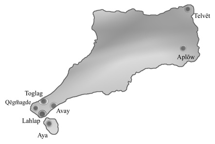 Motalava est une petite île au milieu du groupe des îles Banks. Sur la carte suivante, sont représentées les quinze langues différentes, dont le mwotlap, qui sont parlées dans ce petit groupe d'îles.
