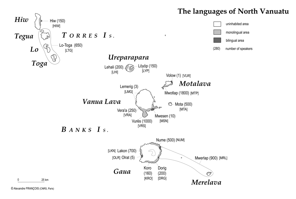 D'abord, il s'agit du seul enregistrement jamais effectué en mwesen, une langue particulièrement menacée puisqu'elle n'est aujourd'hui parlée que par moins d'une douzaine de personnes âgées (cf. 'mwesen' sur la carte). Ces derniers vivent dans des hameaux épars autour du village de Mwesen. À l'image de la géographie, le mwesen se situe linguistiquement à mi-chemin entre le vurës (langue dominante à Vanua Lava, qui a supplanté le mwesen chez les jeunes générations) et le mota. La plupart des derniers locuteurs figurent sur la photo ci-contre, où l'on voit également le chef Tevet, notre narrateur (deuxième en partant de la droite). Le jour où ces personnes disparaîtront, ils emporteront avec eux la langue mwesen. Celle-ci ne sera plus parlée nulle part, et ne survivra, pour ainsi dire, que dans le présent enregistrement.