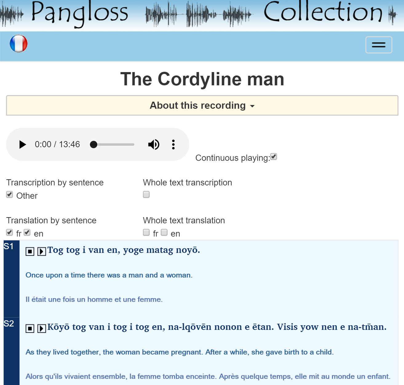 All these stories were first transcribed by hand in the field, with the help of native speakers of the languages; later on, I would type these notes and add them to my digital text corpus (in Toolbox). This work of transcription and translation is still in progress. Later again, the workflow included a stage of time-aligning text and sound, sentence by sentence, aimed at a web publication on the Pangloss interface. (Among the 80+ texts listed above, about 50 were time-aligned in 2013, thanks to the support of the LabEx EFL "Empirical Foundations of Linguistics".)
